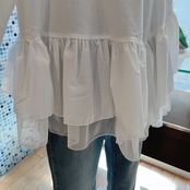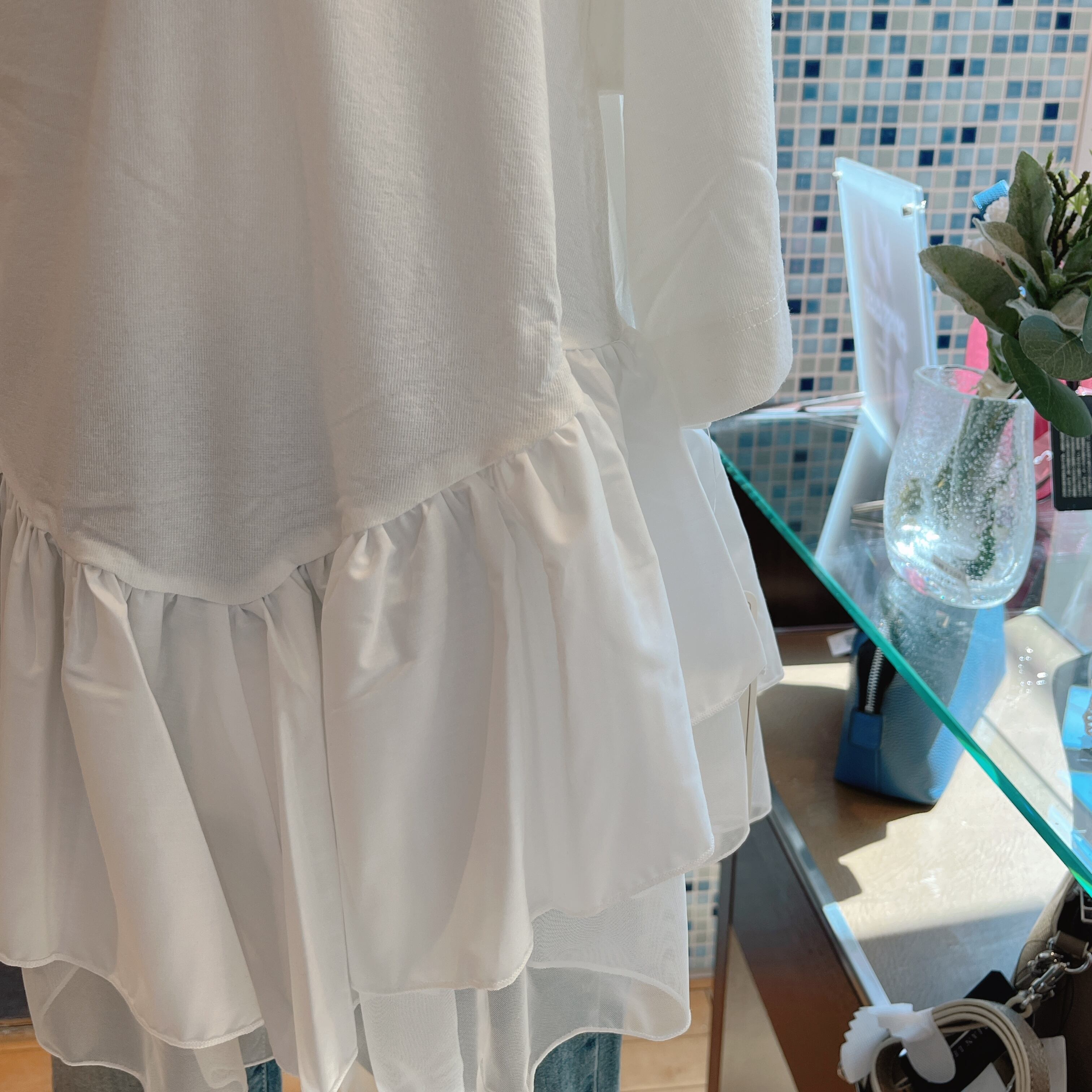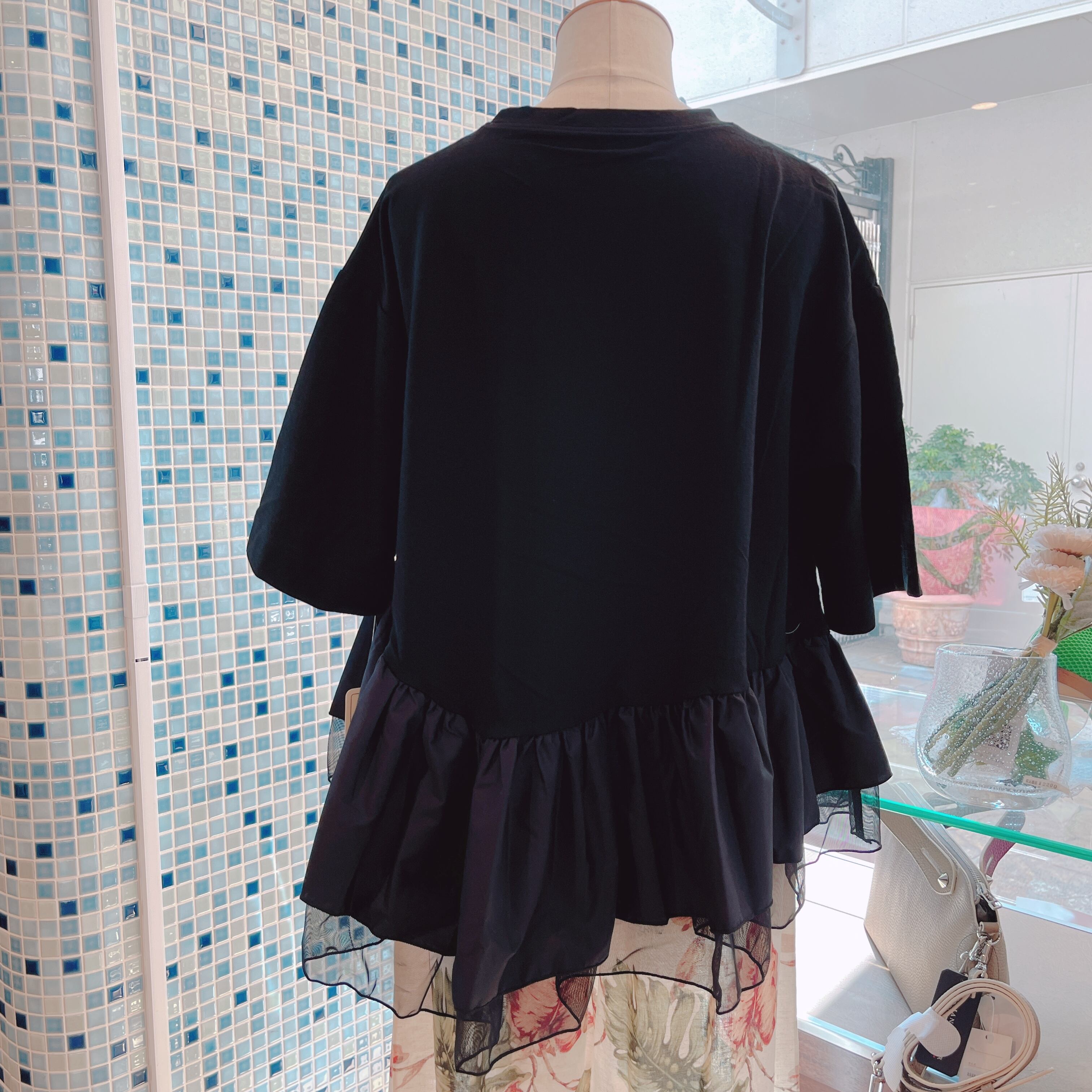 シンプルTシャツ+チュールフリルで甘くなりすぎないフリルトップス