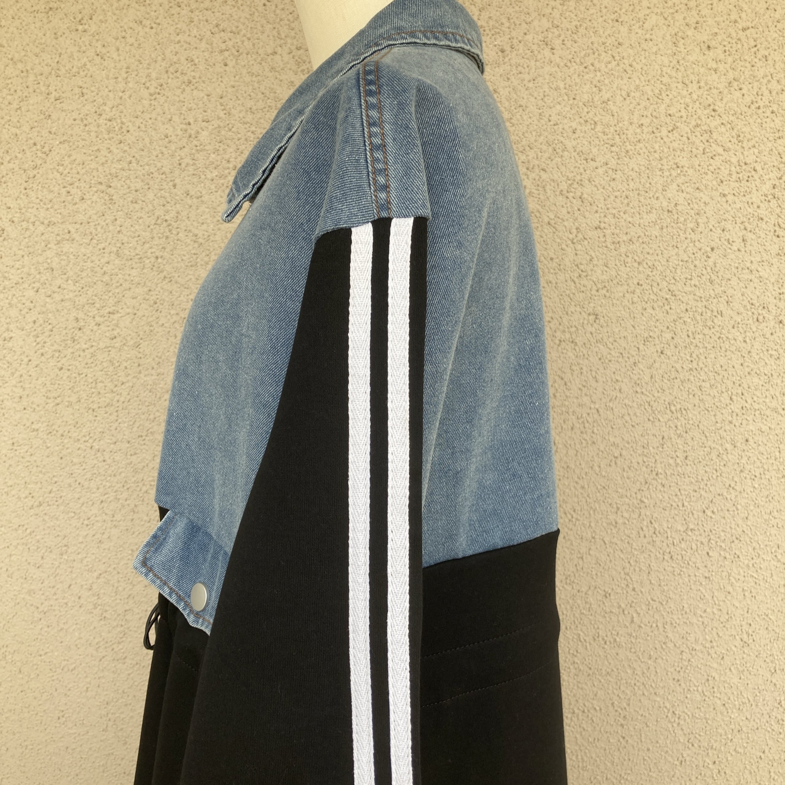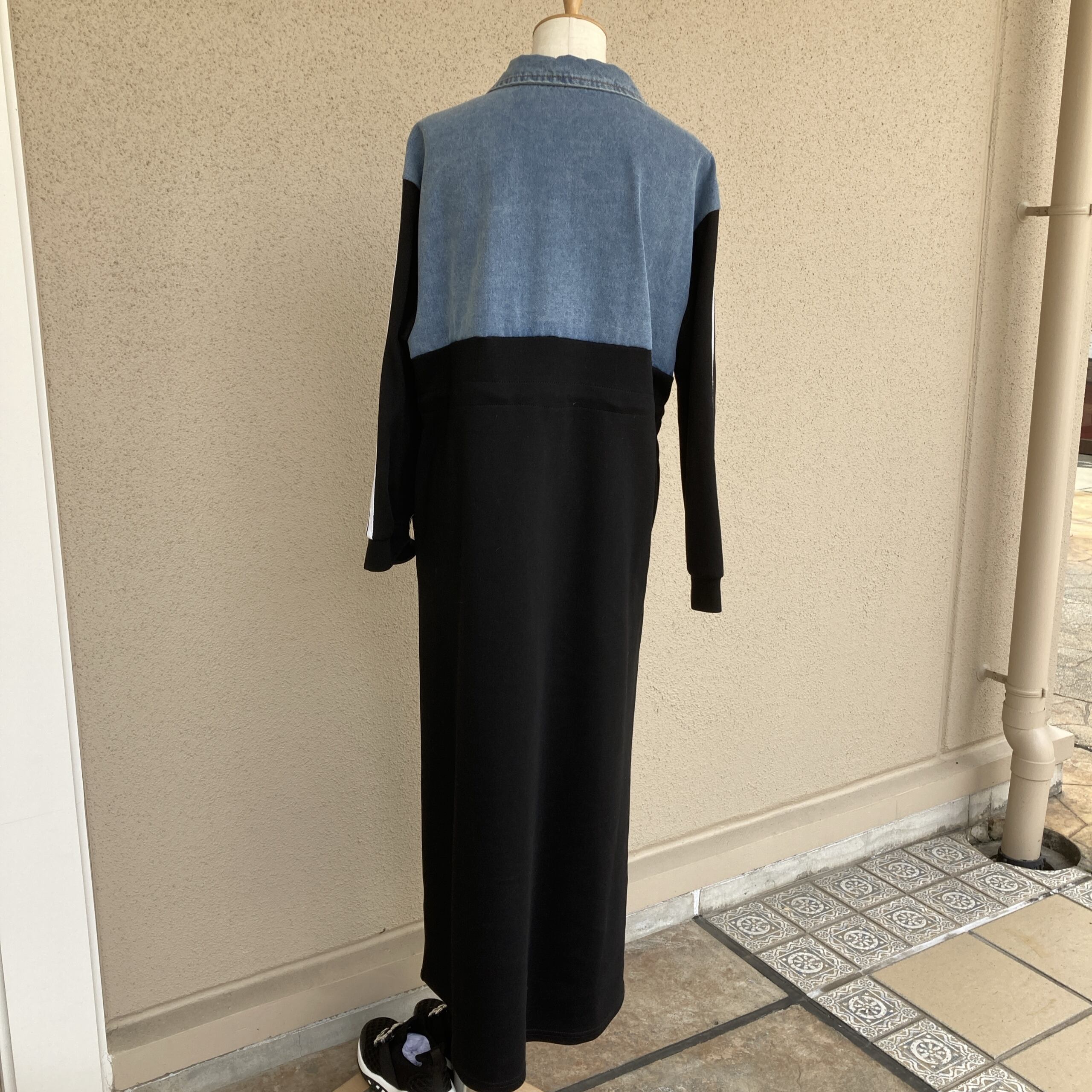 デニムとブラック生地を組み合わせた、異素材デザインが目を惹くワンピース。