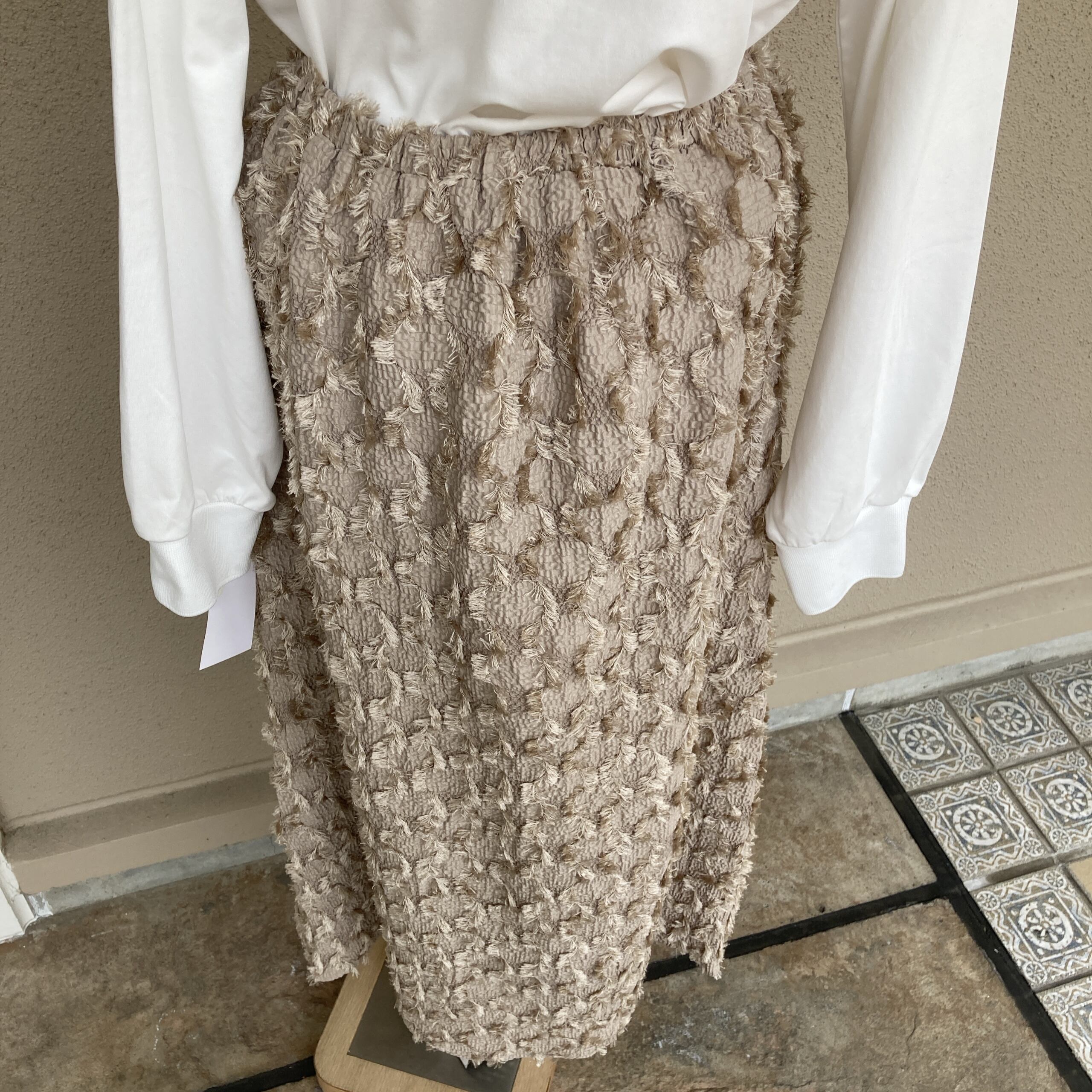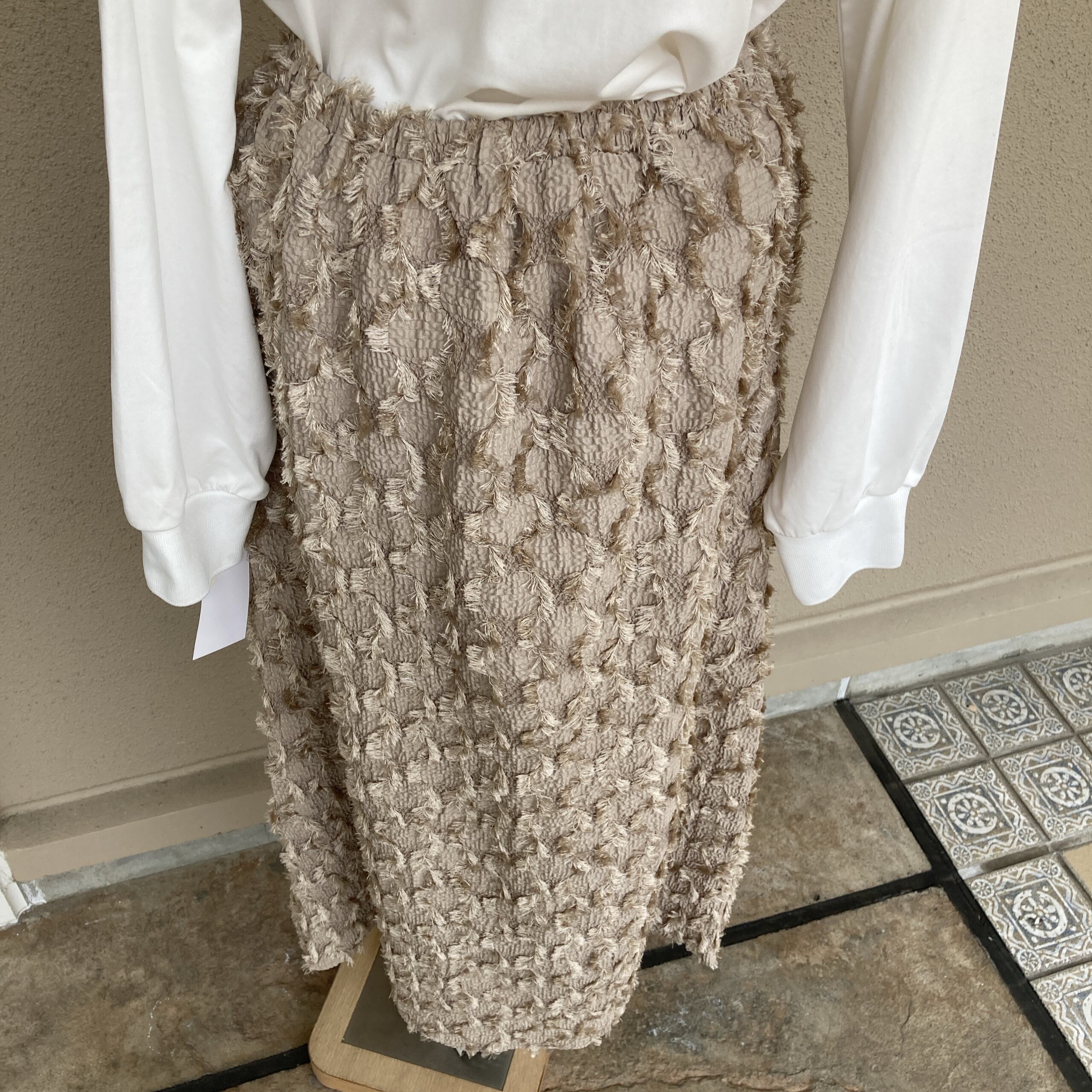 ふんわりと揺れるフェザー素材が目を惹く、華やかなロングタイトスカート。