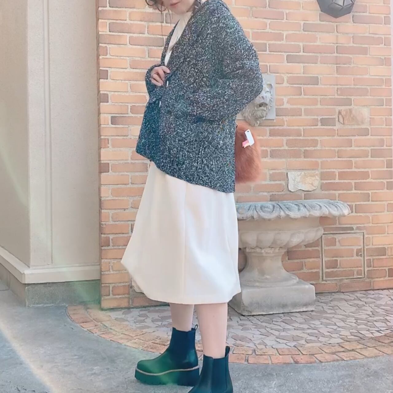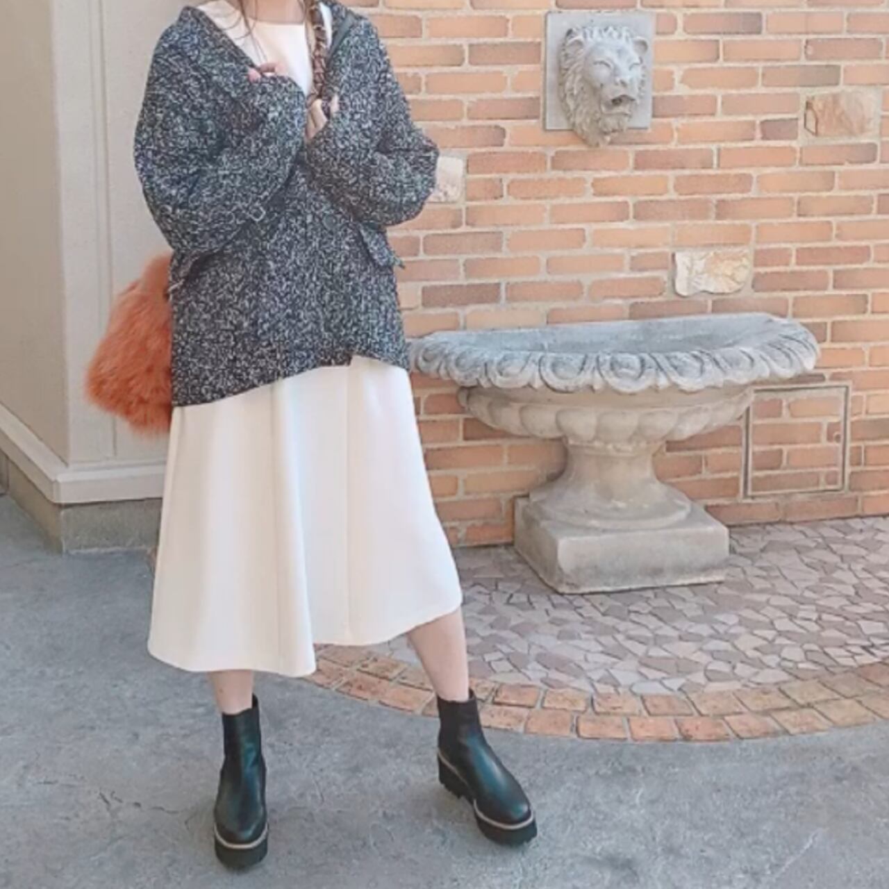 メンズライクなボリュームのあるサイズ感ながら、どんなアイテムとの相性のいい着丈がクールなツイードニットジャケット