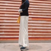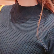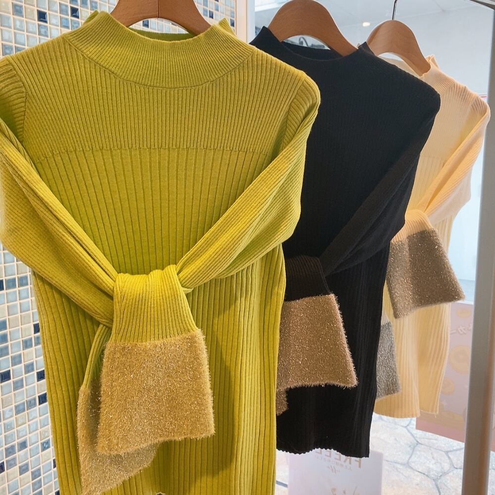 シンプルなリブニットに華やかなラメフェザーフレアデザインの袖口が目を惹くラメフェザーカフスリブニット